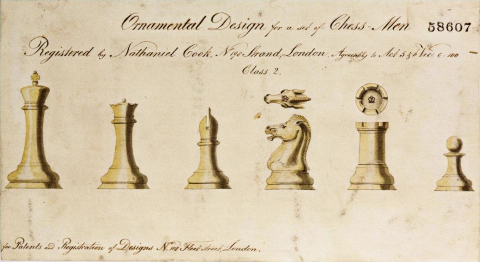 National Archives BT 43/57/58607, notice the incorrect spelling of Cooke Nathaniel Cooke is recognised as the designer and pioneer of the infamous Staunton chess pieces.