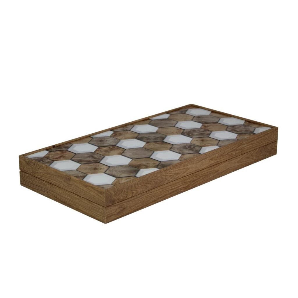 For our Classic Honeycomb Backgammon sets, we prioritize both quality and durability in their construction. The main frames are crafted from 12mm and 4mm First Quality MDF Boards, ensuring they maintain their rigid shape and form over time.Following profiling into various forms and measurements, the MDF parts undergo a wrapping phase with PU glue. The wrapping includes wood-decorated or plain colored alkorcell foils, consistent with the specific product types, enhancing their aesthetic appeal.The inner and outer playing surfaces are treated with a High Glossy (95%) Acrylic UV Cured Varnish. This coating is non-yellowing and free from solvents, smells, and vapors, ensuring a pristine and durable finish.To secure the set, we’ve replaced traditional metal clips with high-grade Neodymium Magnets, offering a reliable closure.Additionally, our sets offer optional accessories such as plastic, acrylic, and polyester chips, larger dices, doubling cubes, and dice cups, depending on the specific product models. With these features, our Classic Backgammon sets provide a timeless combination of elegance and functionality for an enjoyable gaming experience.
