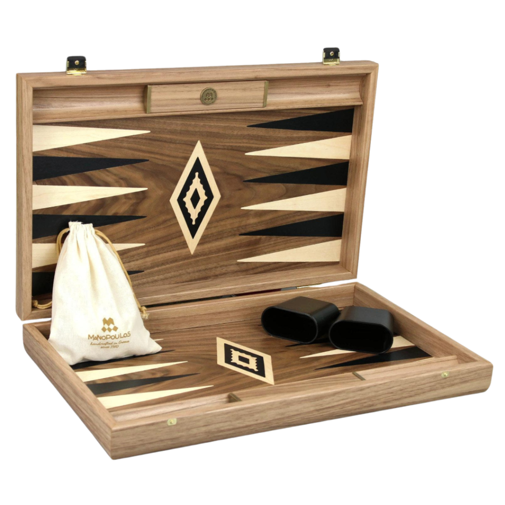 Embark on a journey of elegance with this Walnut Wood backgammon set, boasting a sumptuous finish. This extraordinary product is meticulously handcrafted with inlaid wood in the picturesque landscapes of Greece, showcasing a diverse selection of woods by Manopoulos. Adorned with Walnut inlays followed by ebony and oak points, the board exudes sophistication. The high-quality backgammon set is complete with marbled backgammon pieces, dice, and dice cups, enhancing the pleasure of your gaming experience. Crafted by skilled artisans in Greece, the board features brass metal clasps on either side for a secure closure. Each set is thoughtfully paired with a drawstring Manopoulos bag, ensuring the safety and organization of your dice and backgammon pieces. Representing excellent value for money, this exceptional board is now available for purchase through Chessgammon and includes elegant sideracks for a stylish and functional element while playing.