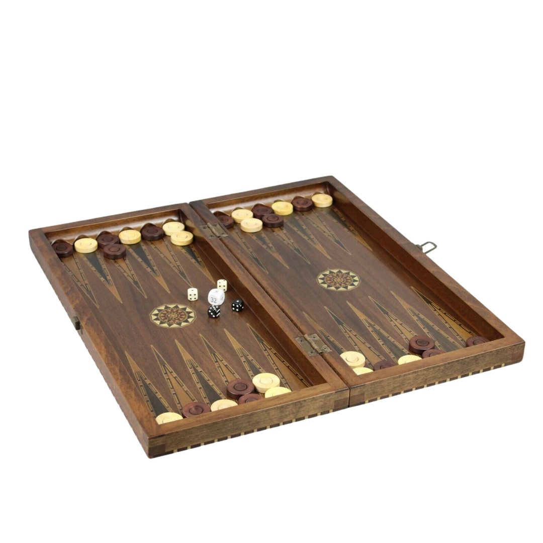 Rural design in Walnut wood, this is a Turkish Backgammon Set/Board with Mother of Pearl inlays from Turkish artists. There are many tiny wood working cuts, scores and shapes that are handset. Different woods inlaid, using the finest Walnut wood and pure natural olive to add a touch of natural and uniqueness to your home. A perfect souvenir, a gift to a loved one or a beautiful addition to a board collection. A set with vibrant and attractive colours along with each piece perfectly and intricately fitted to precision by the most highly skilled and experienced craftsmen. Each piece takes a painstaking number of weeks to prepare of build completely by hand. Made by an incredibly reputable brand in Helena Wood Arts.