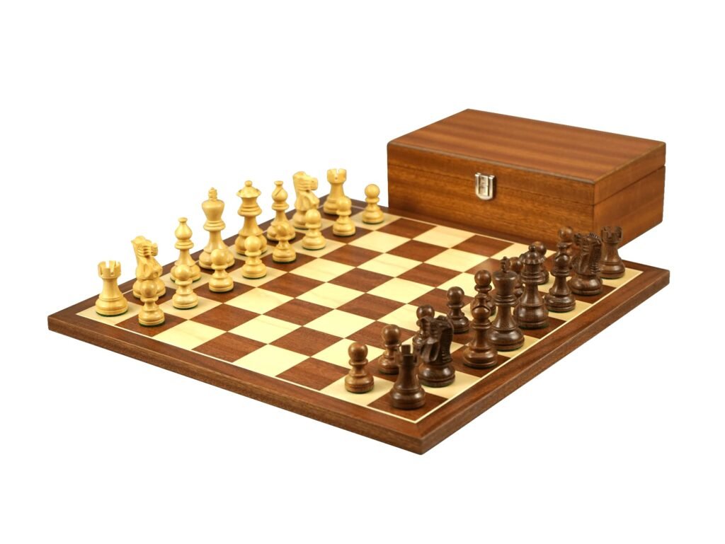 Introducing the epitome of sophistication – the Mahogany Chess Set. The chessboard, a testament to artistry, features inlaid squares that merge Walnut’s depth with Maple’s radiance. This composition creates a captivating visual tapestry, an exquisite stage for your strategic encounters. This remarkable chessboard, crafted in Spain, is not just a game; it’s an heirloom that promises years of elevated play.