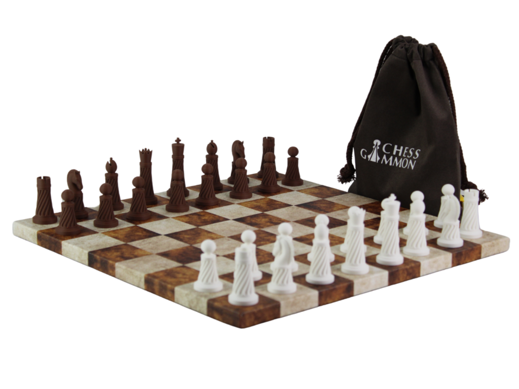 The pieces rest on a sophisticated brown leatherette chessboard that exudes elegance and durability, making this set an exceptional gift for chess enthusiasts or a distinguished addition to your own collection. The included drawstring bag ensures easy storage and portability, so you can take your game wherever you go. Whether for display or play, this chess set brings luxury, functionality, and eco-conscious appeal to every move.