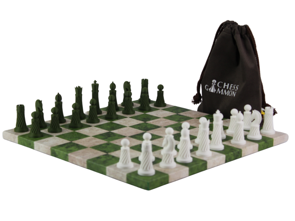 The pieces rest on a sophisticated green leatherette chessboard that exudes elegance and durability, making this set an exceptional gift for chess enthusiasts or a distinguished addition to your own collection. The included drawstring bag ensures easy storage and portability, so you can take your game wherever you go. Whether for display or play, this chess set brings luxury, functionality, and eco-conscious appeal to every move.