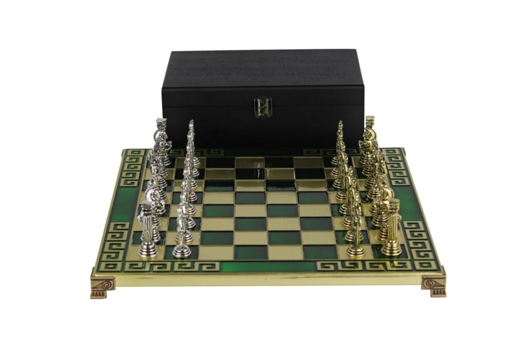 Step into a realm where strategic prowess meets timeless Greek mythology with our remarkable 13-Inch Green Greek Metal Chess Set. This captivating ensemble seamlessly blends the elegance of Greek aesthetics with the strategic depth of the game, creating a unique masterpiece that appeals to chess enthusiasts and collectors alike.