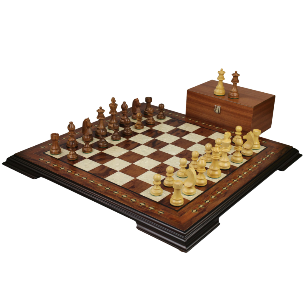 Our collection proudly features these Staunton chessmen, crafted by the finest and most skilled artisans in Amritsar, India. As part of this extraordinary offering, a luxurious chess piece storage box fashioned from mahogany wood is included. This opulent box not only showcases a stunning veneer but also offers ample space, accommodating pieces ranging from 3 to 4 inches in size. The box is thoughtfully lined with plush black velvet felt, ensuring that your treasured chess pieces remain impeccably preserved. Indulge in the artistry of chess with the distinguished Rosewood Helena chess set, where tradition, craftsmanship, and beauty converge to elevate your chess-playing experience.