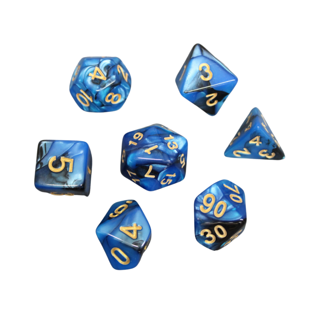 Crafted with a marbled blend of cobalt blue and deep swirls, each die captures the look of liquid blue frozen in time. The engraved numbers are bold and easy to read, ensuring precision in every game. Whether you’re casting spells, battling dragons, or exploring dungeons, these dice provide a reliable and stylish companion for every adventure.